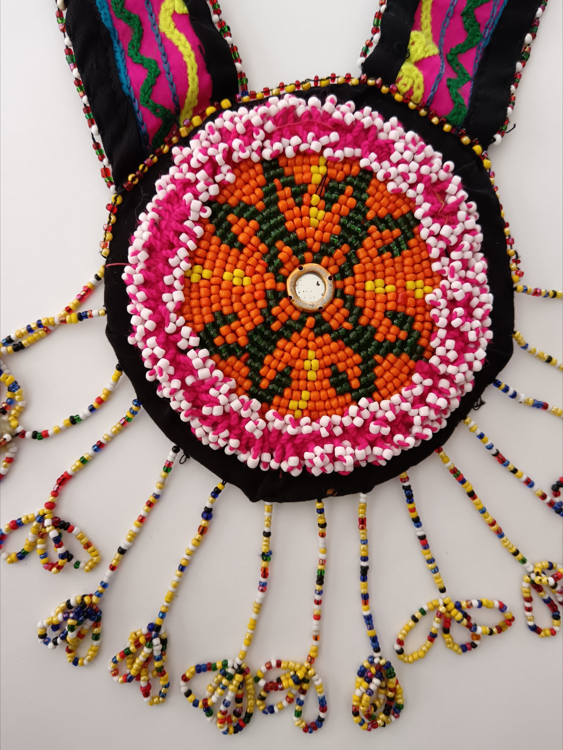 Using Ancient traditions and transforming them into modern expressions, this unique piece is a complete symbol of that. Created using antique beading from Afghanistan and trim from Thailand this special necklace stands bold on anyone who wears it.